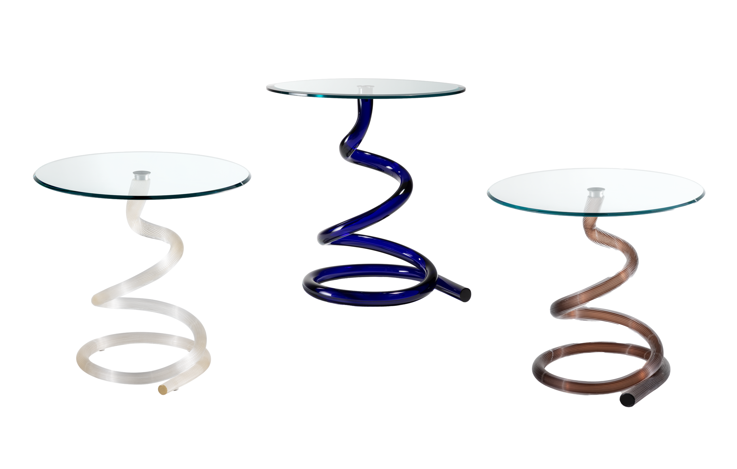 Tavolino con base in vetro di Murano rigato e piano in vetro, disponibile in diverse varianti cromatiche.