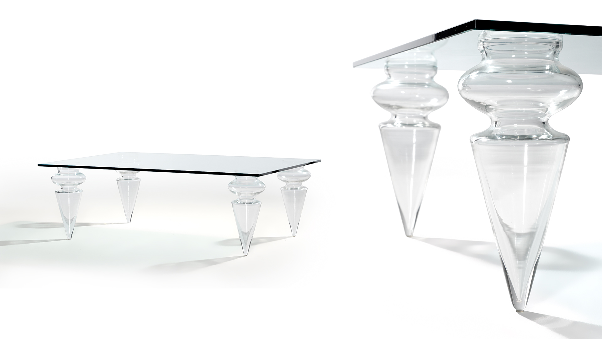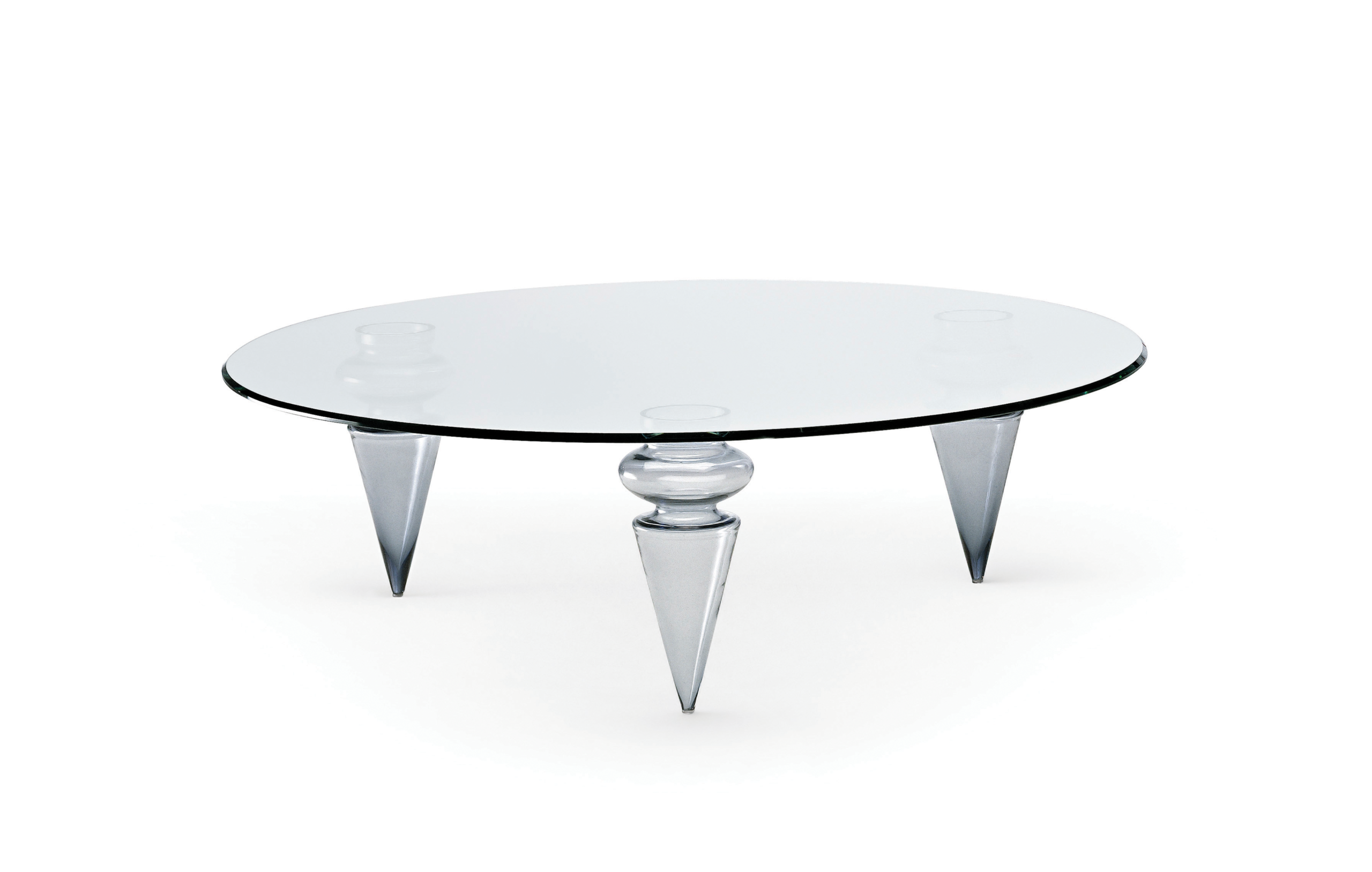 Tavolino con gambe in vetro di Murano trasparente liscio e piano in vetro, disponibile in diverse configurazioni di forma e finitura.