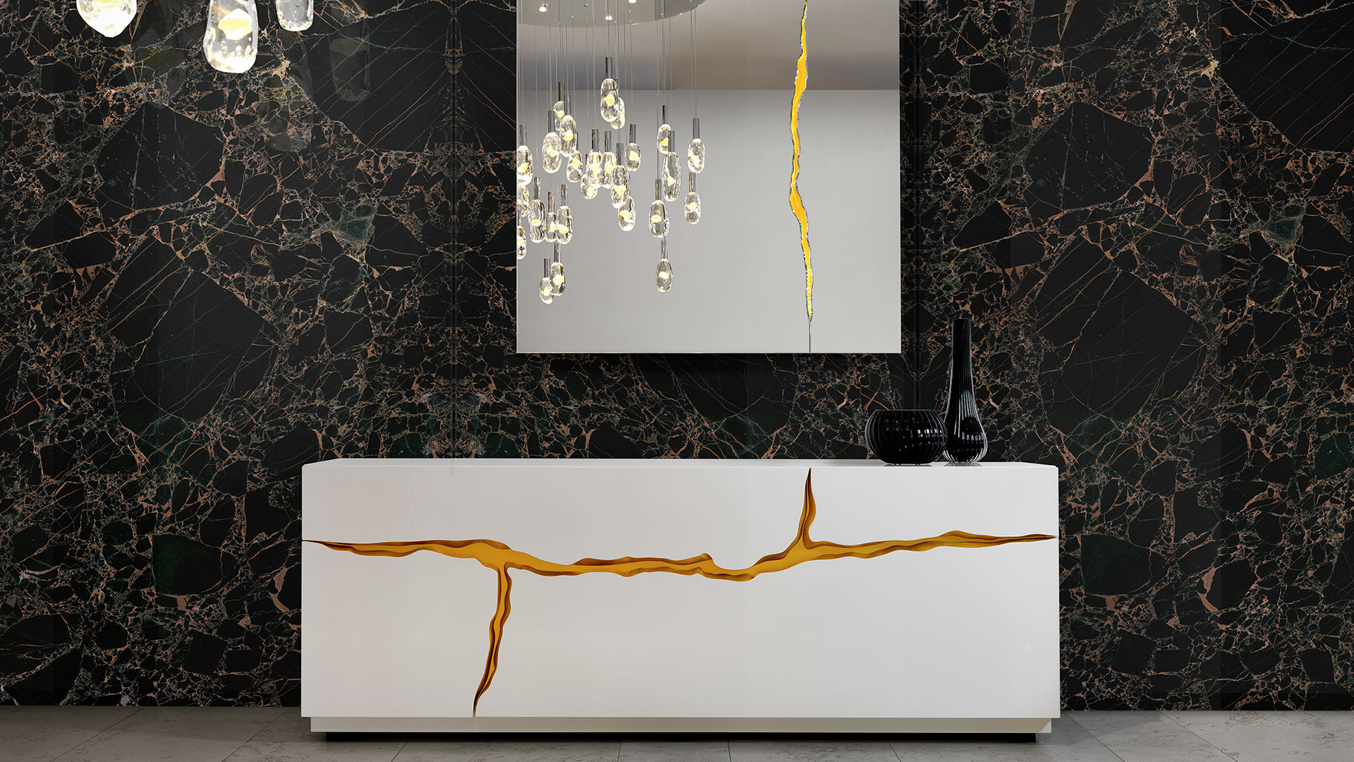 Buffet in legno laccato lucido con elementi contenitivi e decoro frontale in finitura oro o ottone.