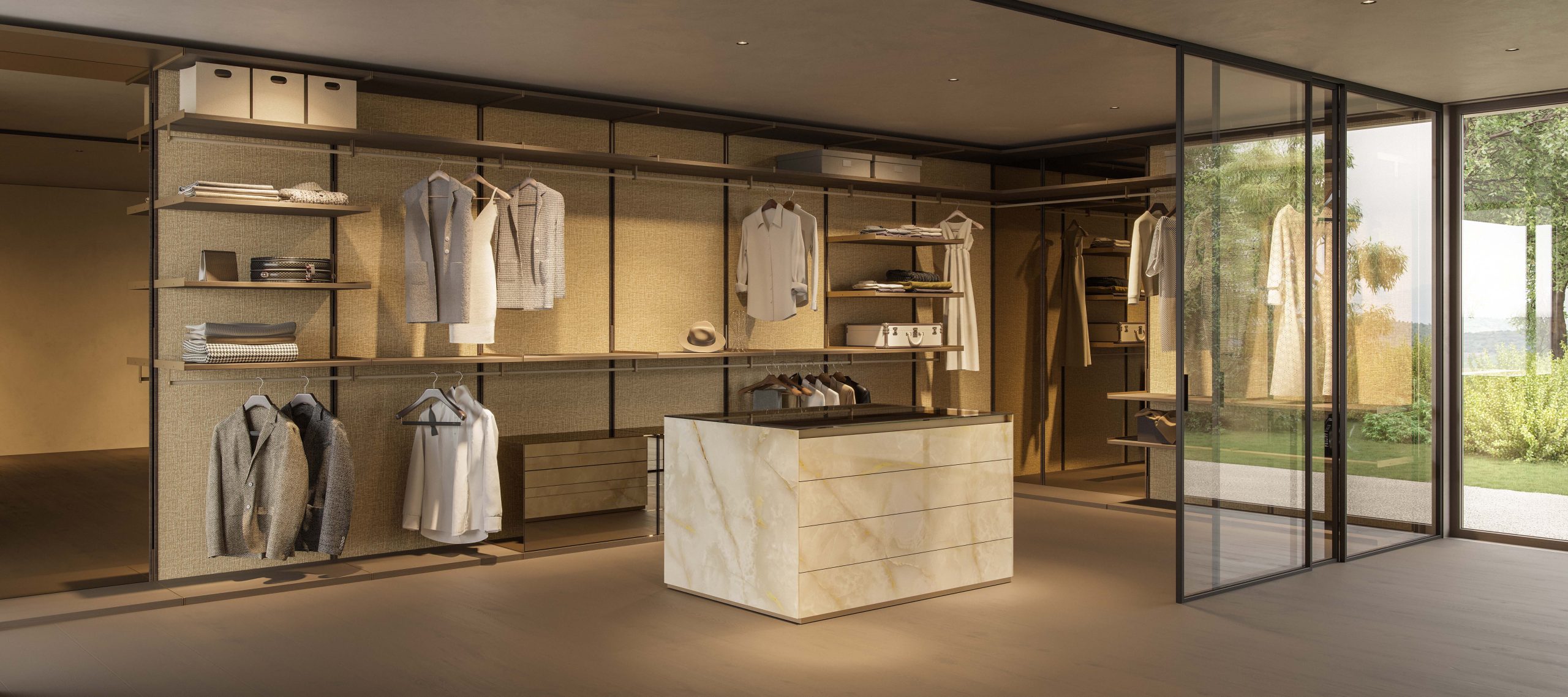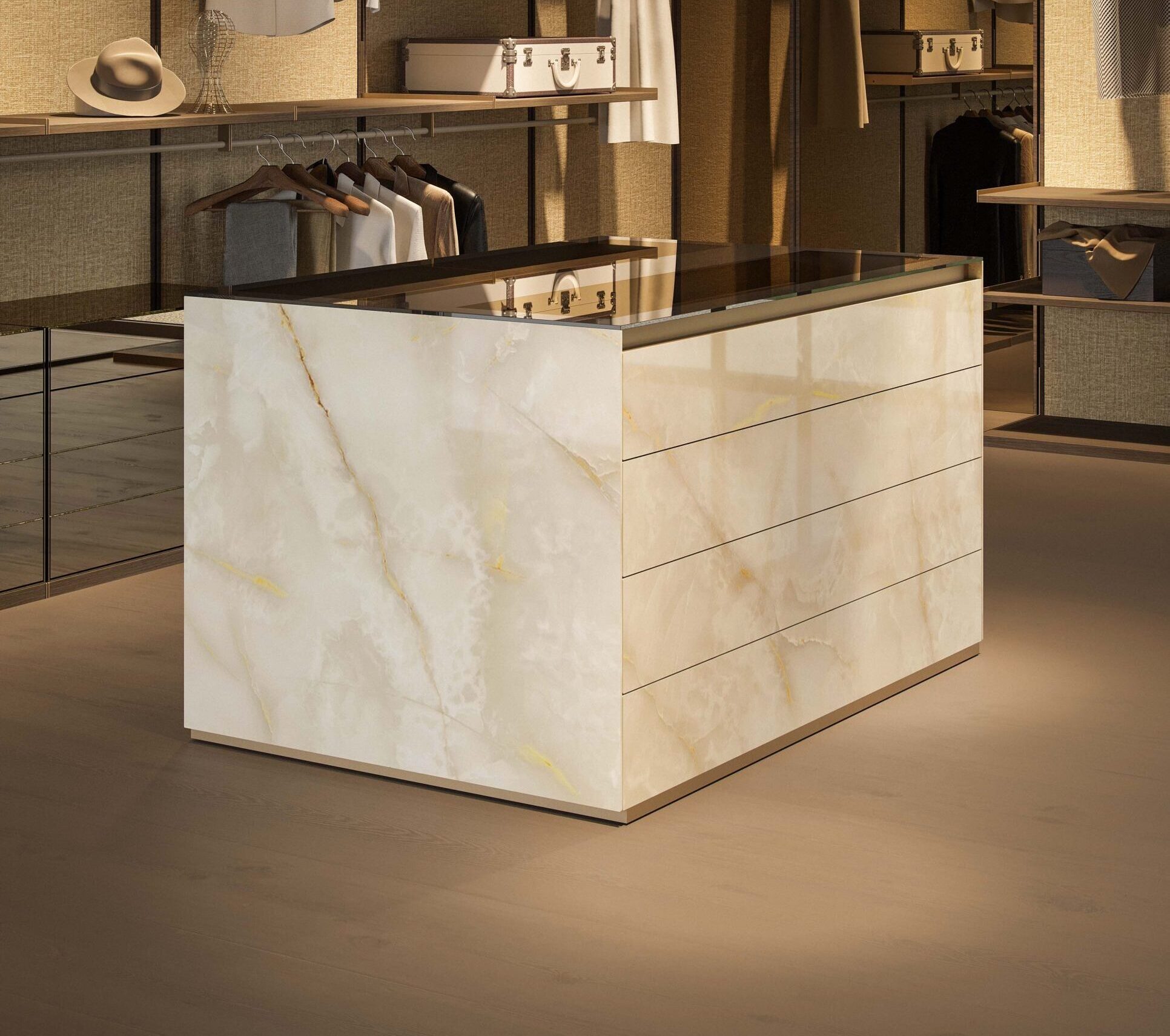 Elemento isola o comò a 8 cassetti caratterizzato da un volume solido e architettonico, con rivestimento continuo in vetro e dettagli metallici che ne definiscono il perimetro. Un oggetto pensato per essere centrale nello spazio, leggibile da ogni lato.