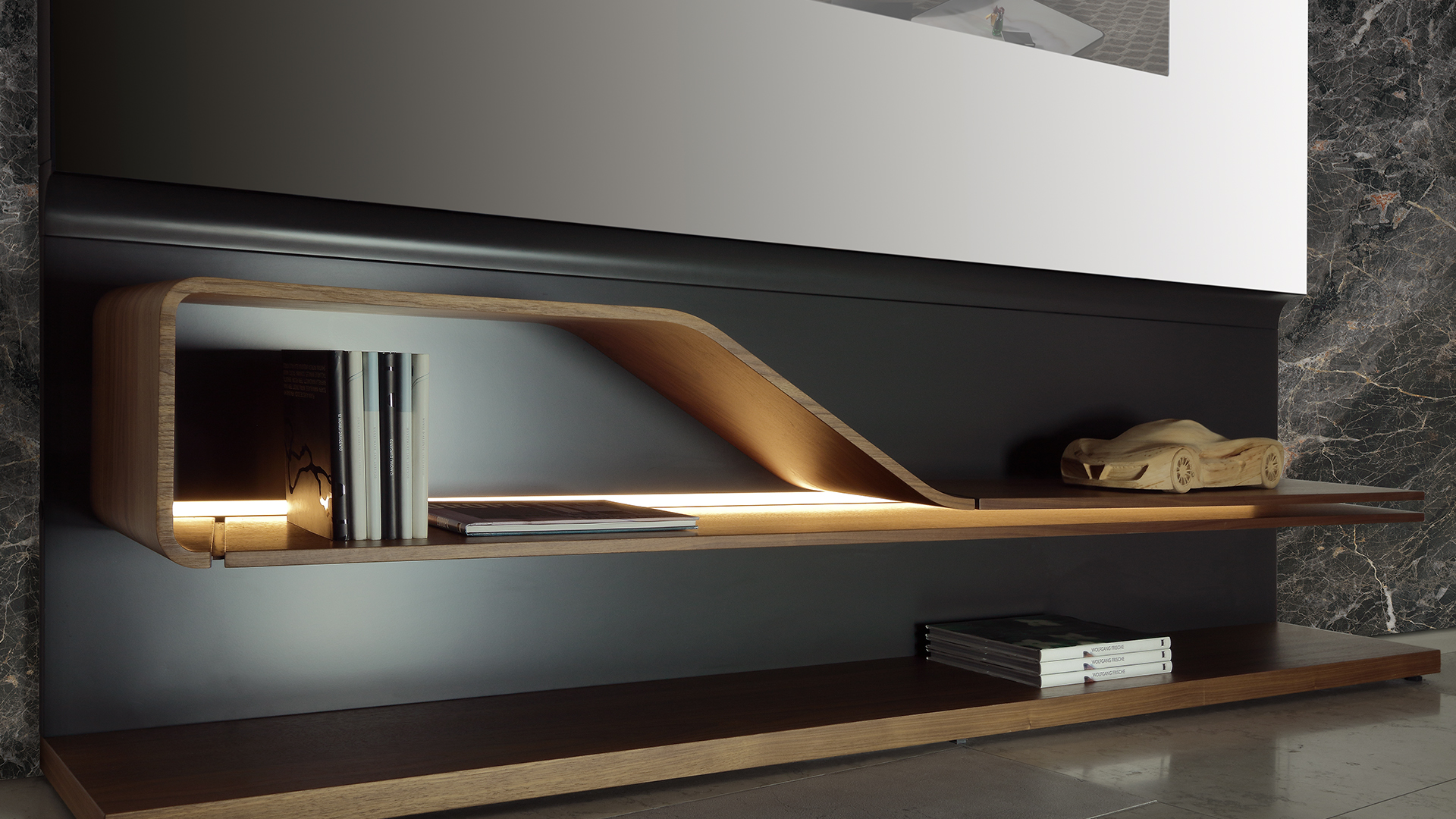Porta TV in vetro Mirror View con serigrafia nera per TV (spessore massimo 7 cm) e cornici in legno laccato opaco colore Henné. Modulo inferiore Segno Libreria (design Pininfarina) con mensola sagomata e zoccolo. Illuminazione LED su mensola e prese USB–HDMI su telaio con sportellino