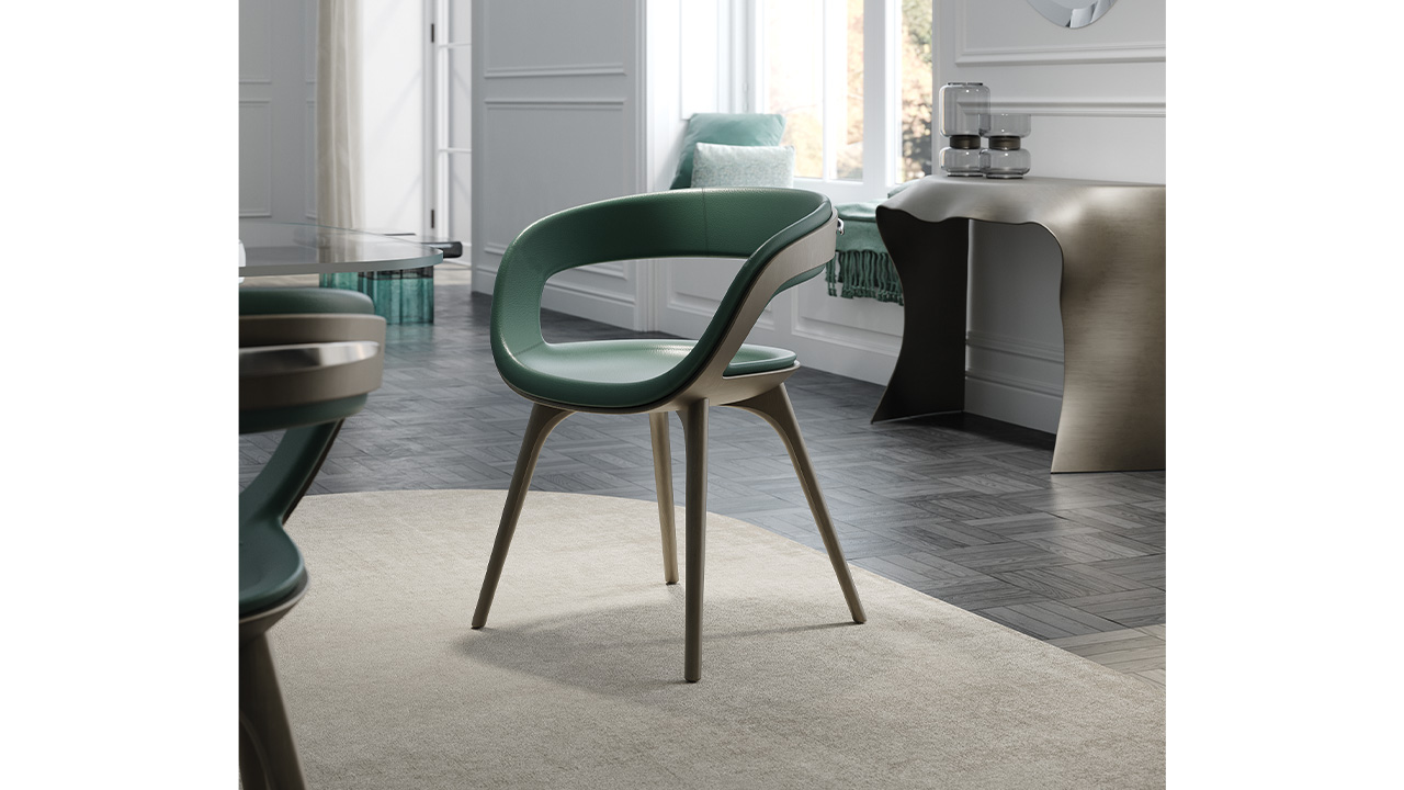 Sedia con scocca esterna e gambe in finitura Bronze (100M). Seduta e schienale imbottiti e rivestiti. Maniglia in acciaio lucido.