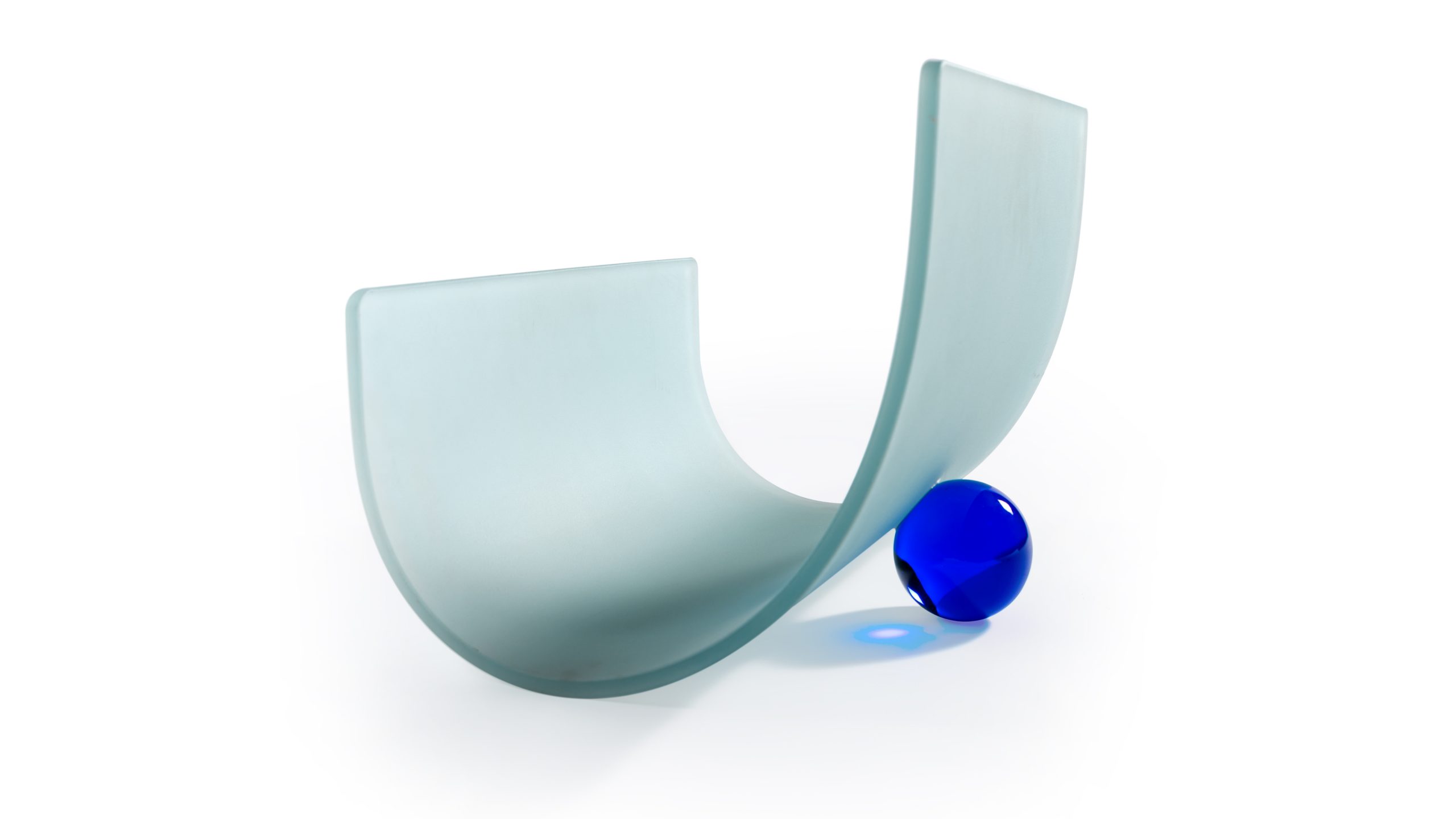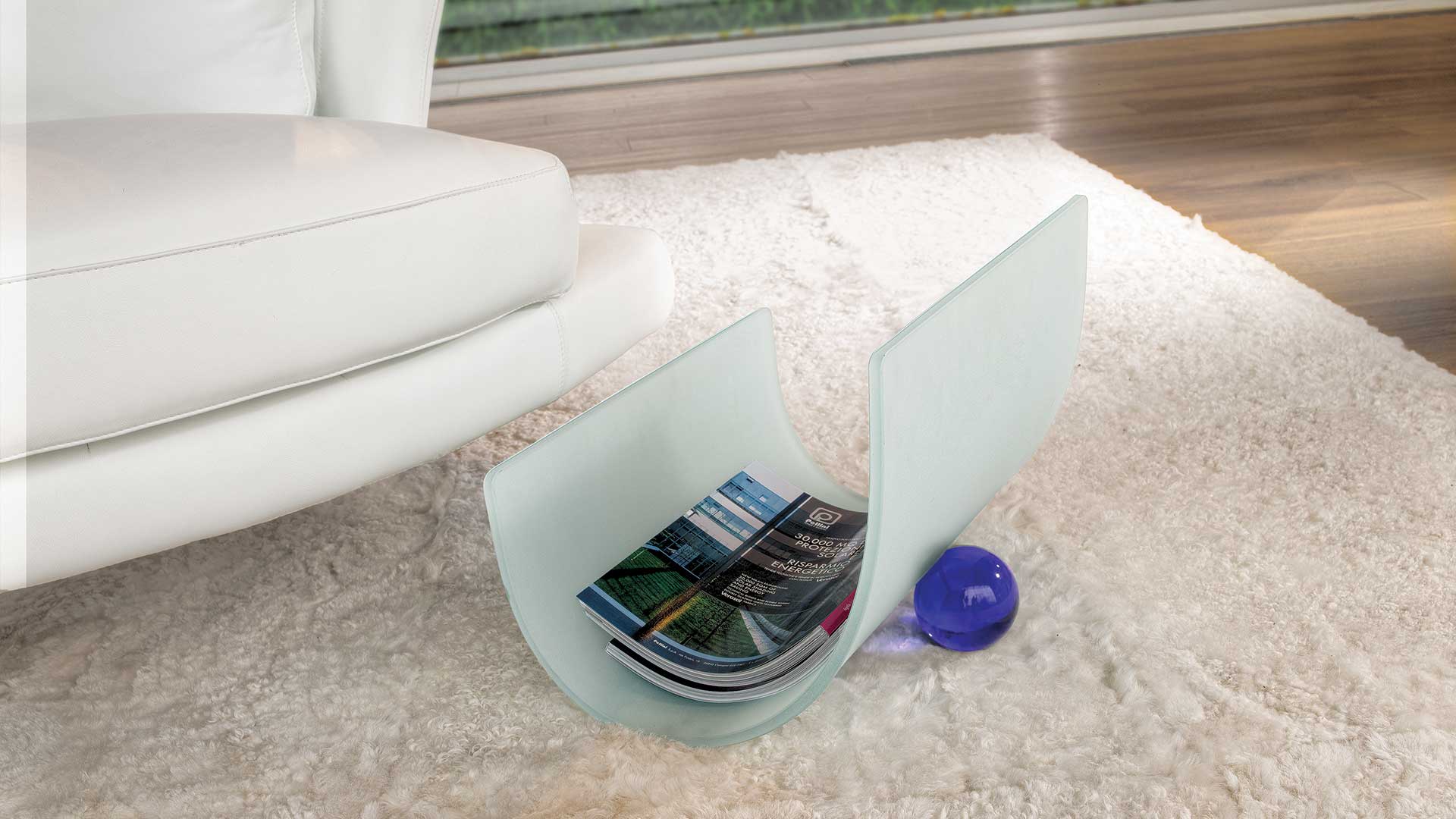 Portariviste dal linguaggio essenziale e scultoreo, realizzato in vetro curvato sabbiato con elemento decorativo in vetro di Murano che introduce un accento cromatico controllato.