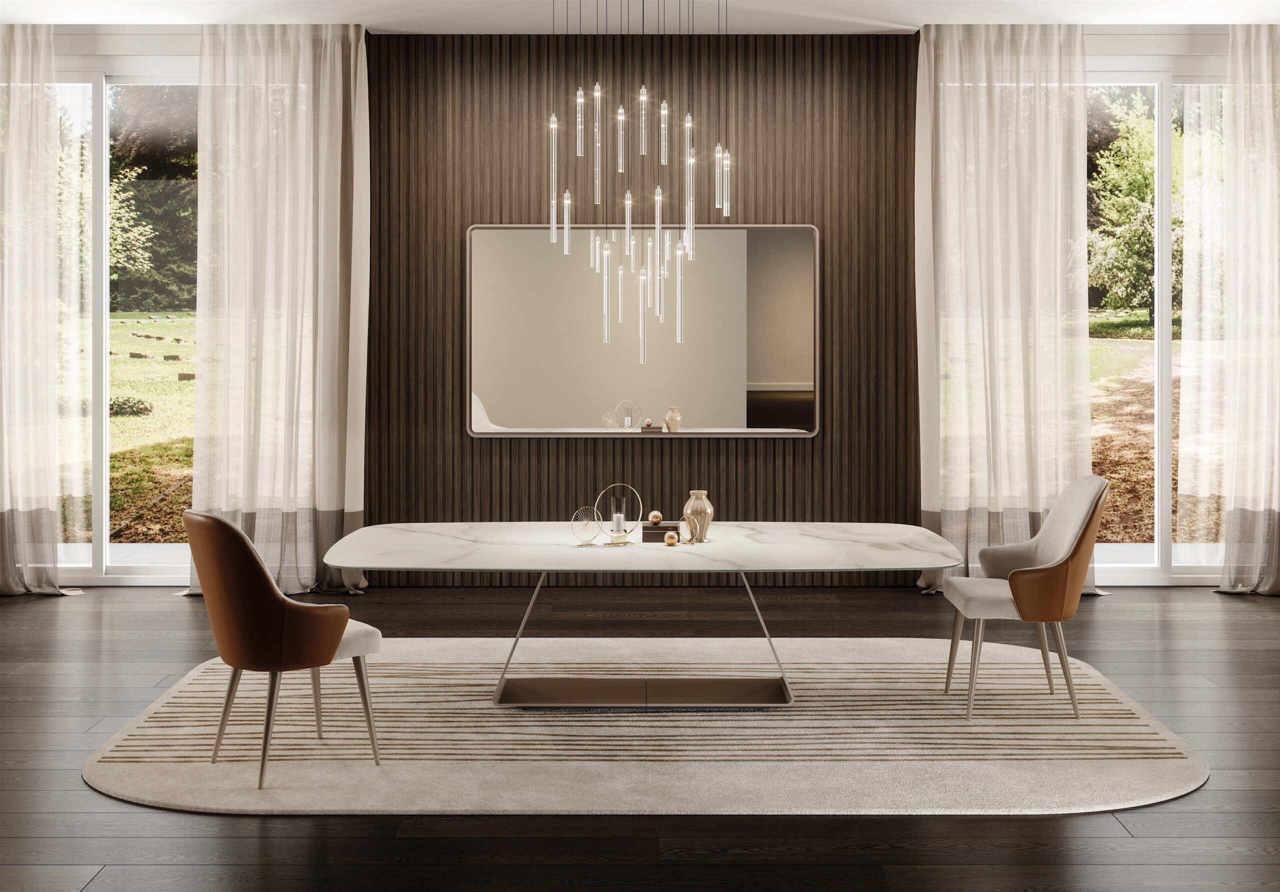 Tavolo da pranzo con base in metallo piegato e piano disponibile in diverse configurazioni materiche.