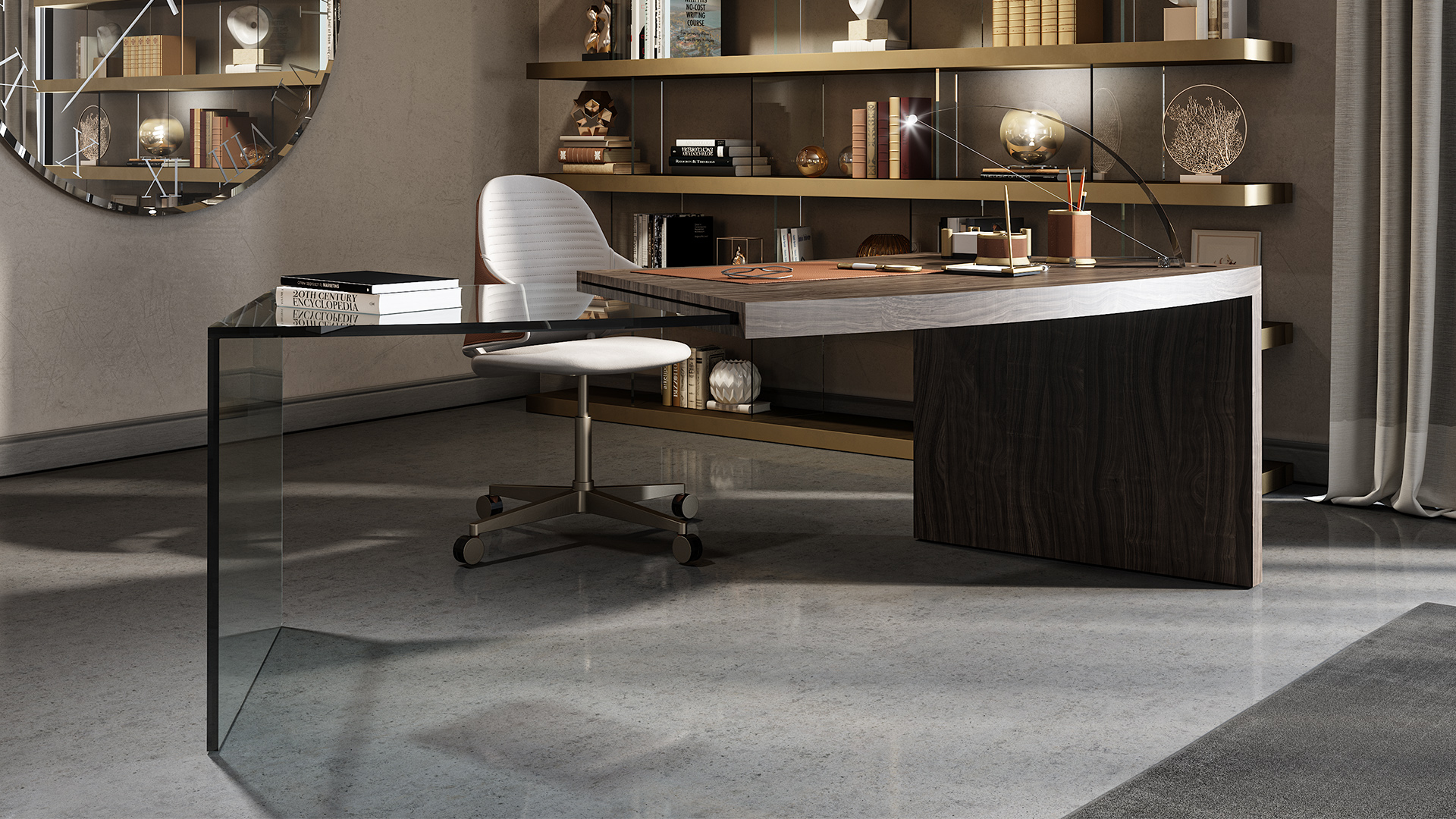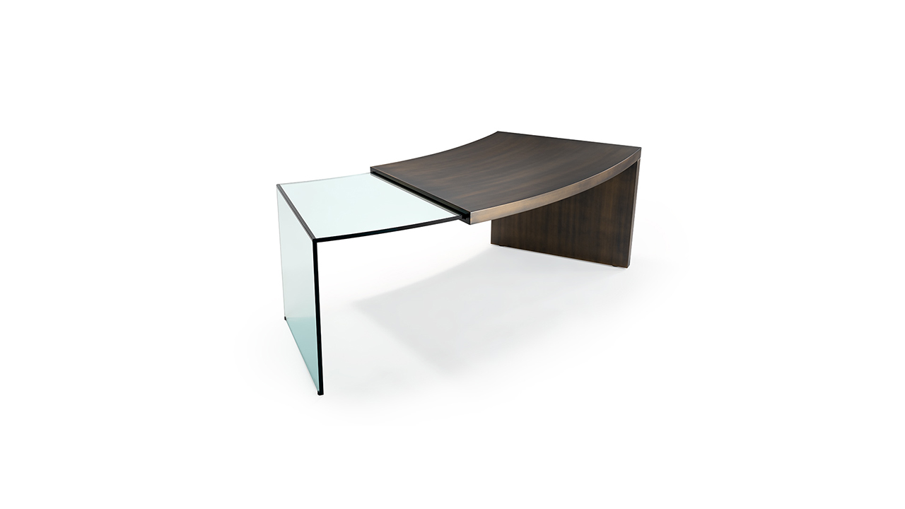 Scrivania dal carattere leggero e contemporaneo, definita dal contrasto tra superfici lignee e vetro strutturale. Il piano mobile introduce una funzione dinamica che amplia l’area operativa senza alterare l’equilibrio formale del progetto.