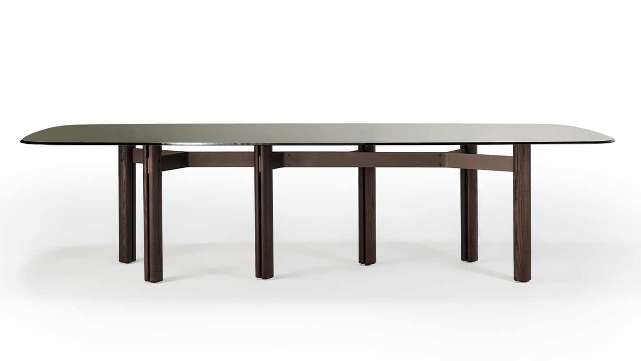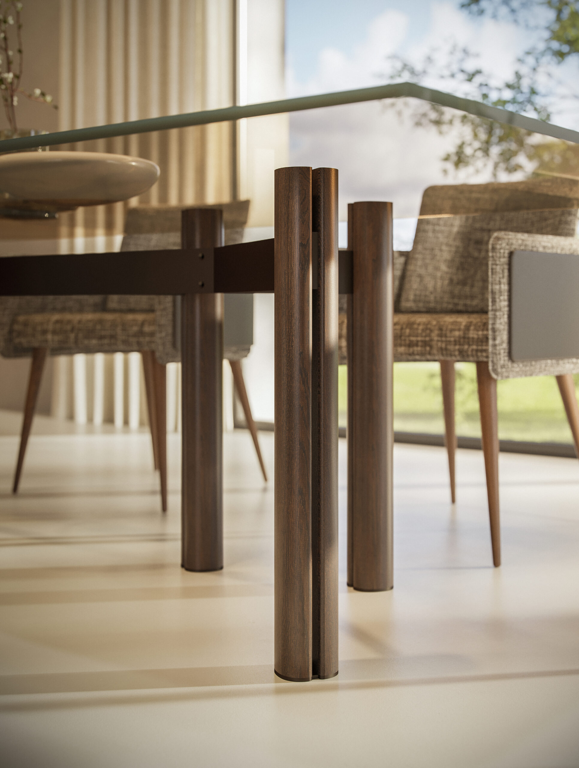 Tavolo da pranzo con basamento composto da struttura in metallo e gambe in legno, caratterizzato da un equilibrio tra materia industriale e naturale.