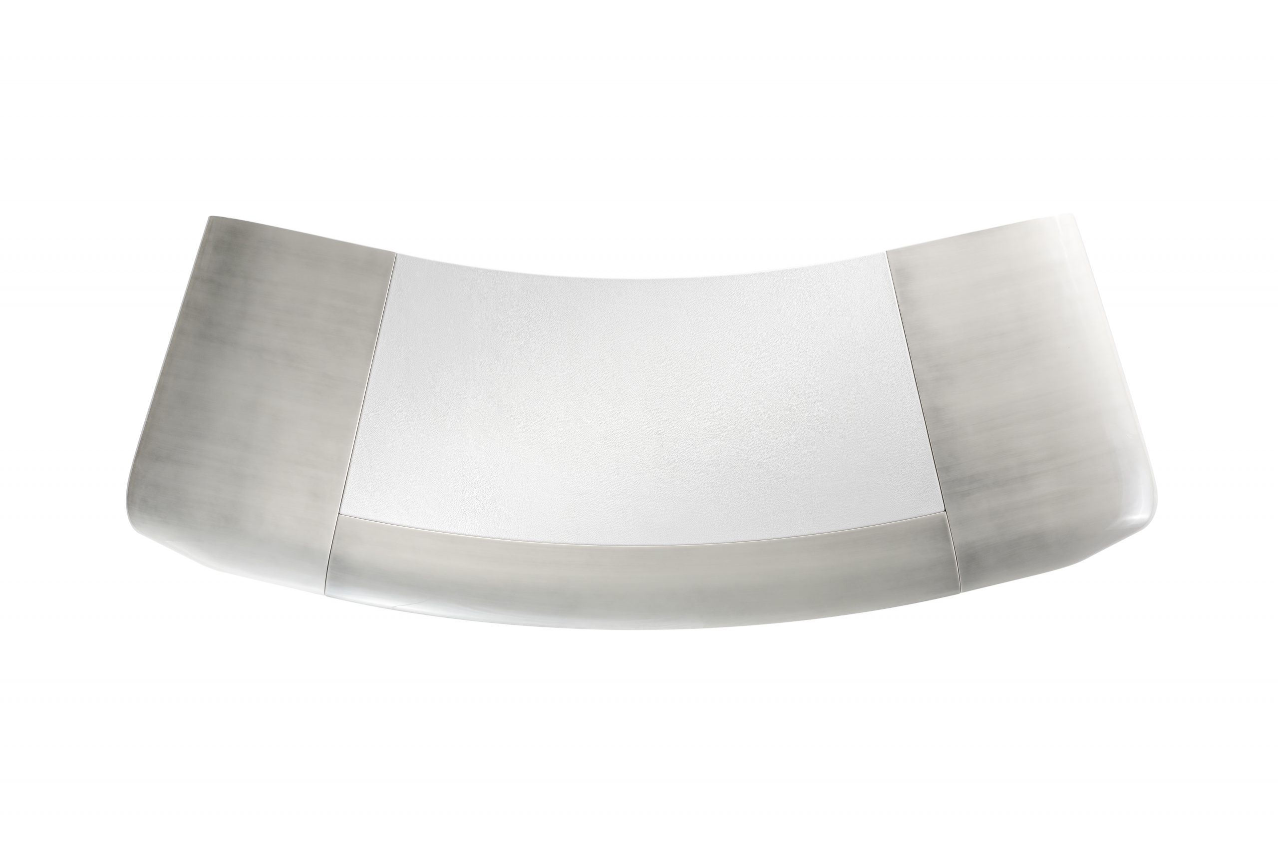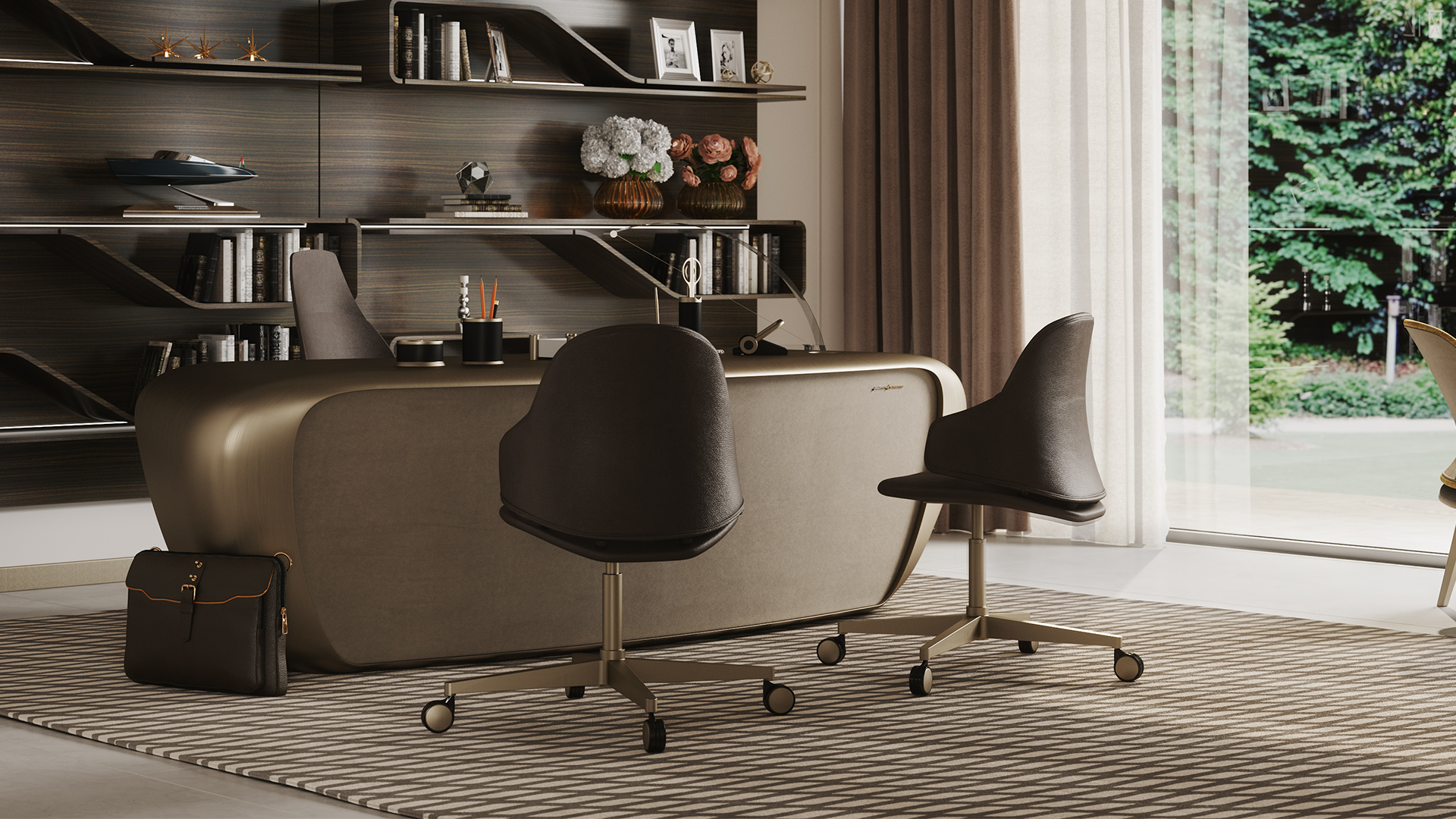 Scrivania direzionale dal segno fluido e continuo, caratterizzata da una struttura metallica curvata che definisce un’immagine scultorea ma funzionale. Il rivestimento in pelle Naturale sul frontale e, opzionalmente, sul piano, introduce una dimensione tattile e sartoriale, mantenendo un’impostazione rigorosa e professionale.