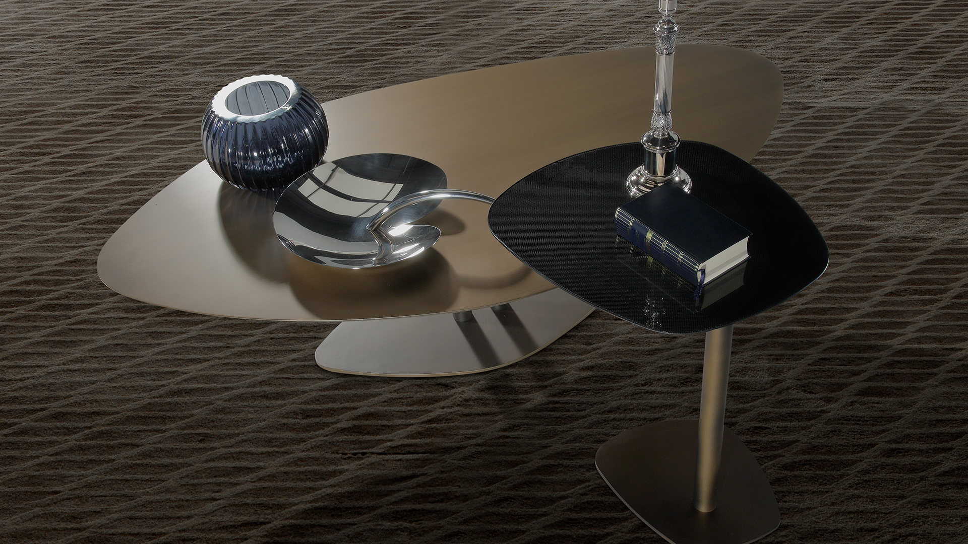 Tavolini da salotto e da appoggio con piani sagomati in vetro e base in metallo, pensati come elementi trasversali per living e lounge, declinabili attraverso diverse materie di piano a parità di struttura.