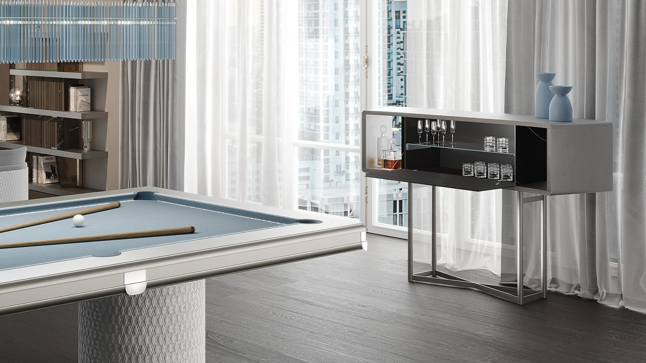 Bar con struttura sagomata in legno verniciato. Anta a ribalta in Marmoreflex/Legnoreflex con apertura push-pull. Ripiano interno in vetro. Basamento in metallo verniciato in tinta con la struttura.
