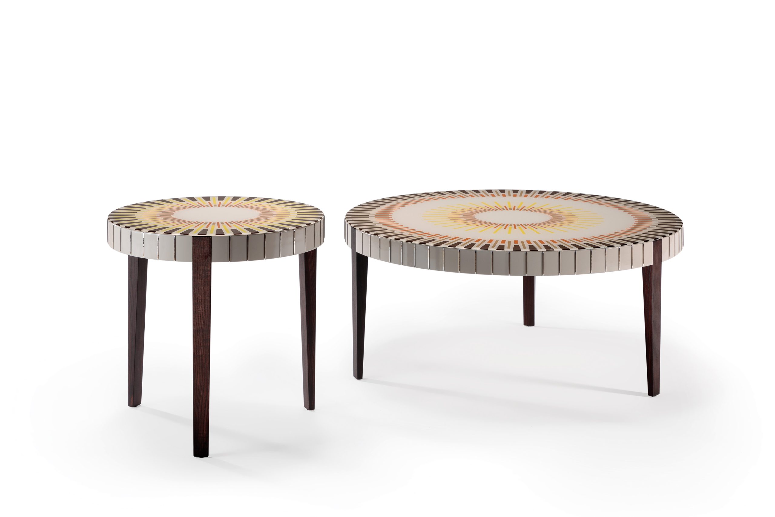 Tavolini da salotto con piano in legno e cover decorativa in vetro digitale, pensati come elementi d’accento in cui materia naturale e superficie grafica dialogano in modo controllato e raffinato.