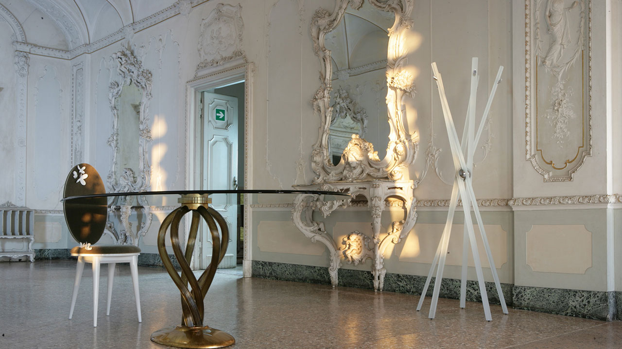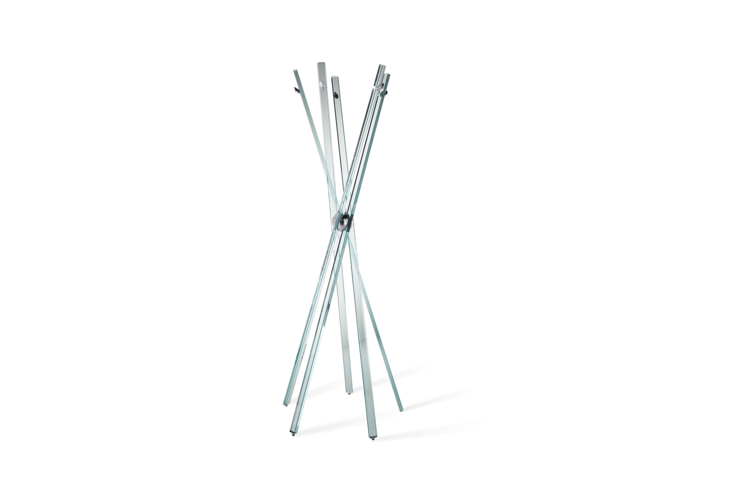 Appendiabiti da terra con struttura minimale in vetro temperato, caratterizzato da dettagli metallici a contrasto che ne definiscono il linguaggio essenziale ed elegante.