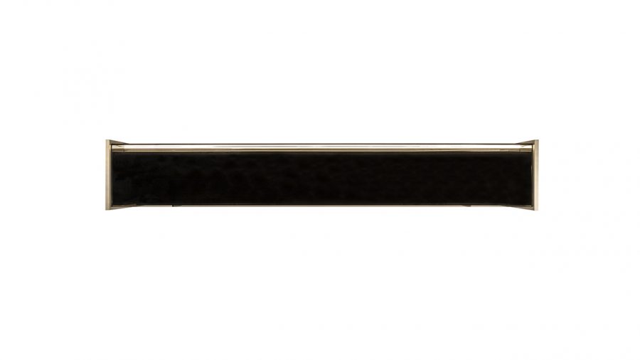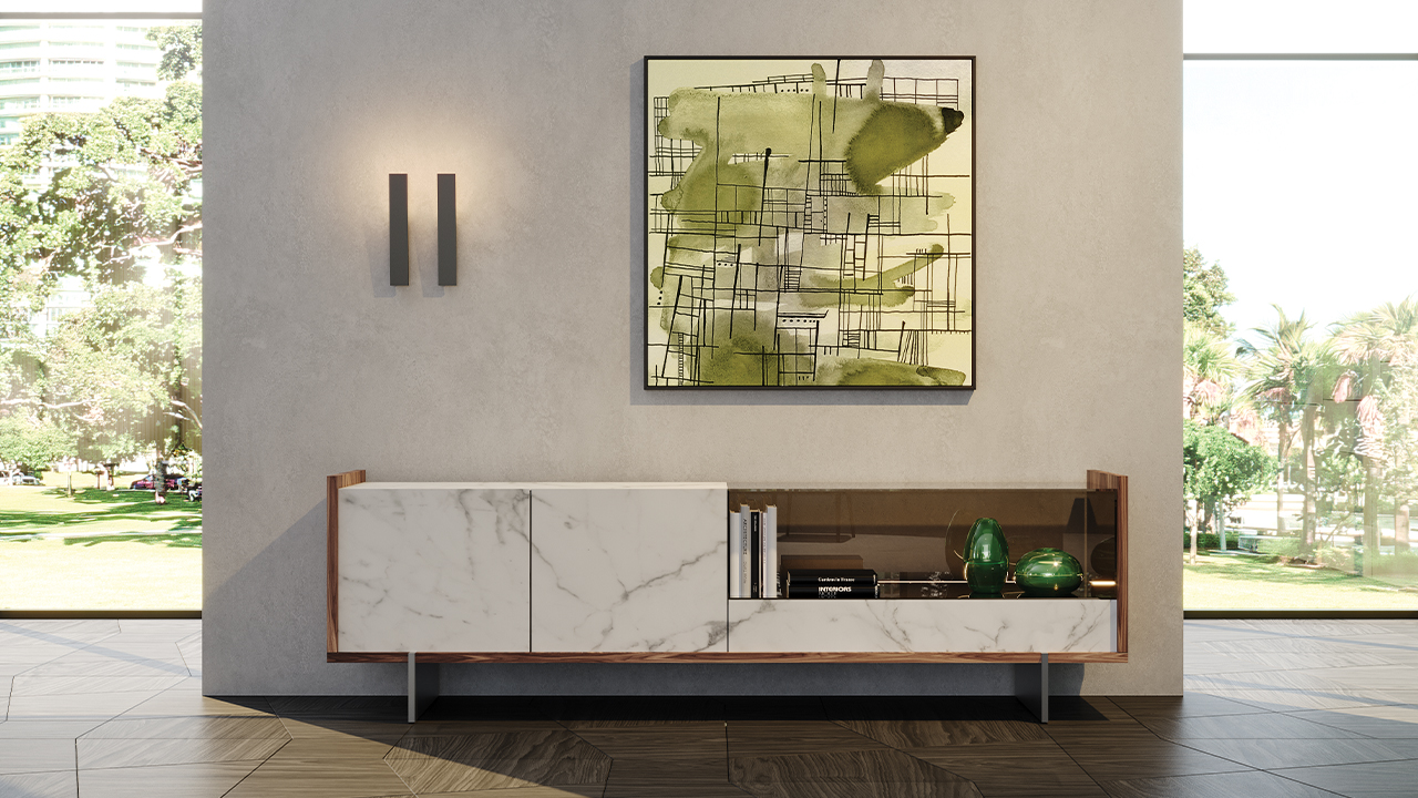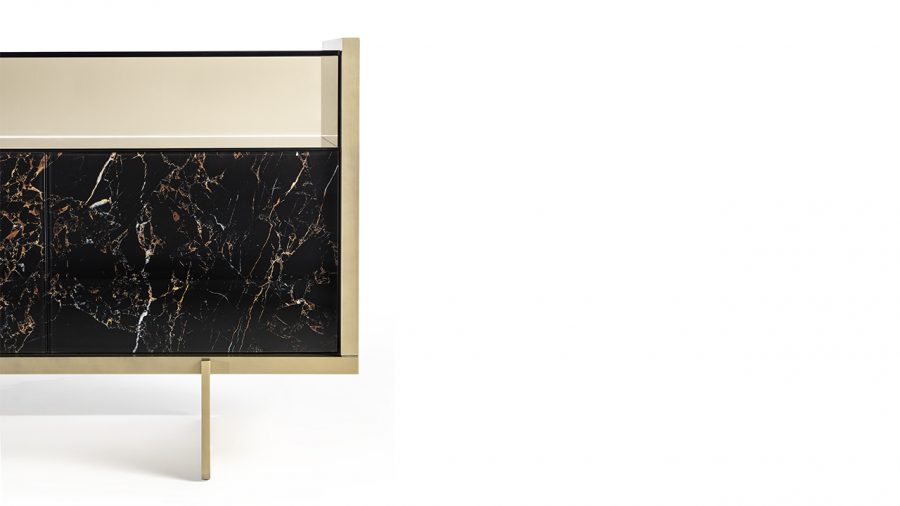 Buffet con struttura in legno. Piedini in metallo finitura Bronze (100M). Elementi frontali in Marmoreflex o Legnoreflex. Teca in vetro con illuminazione LED.