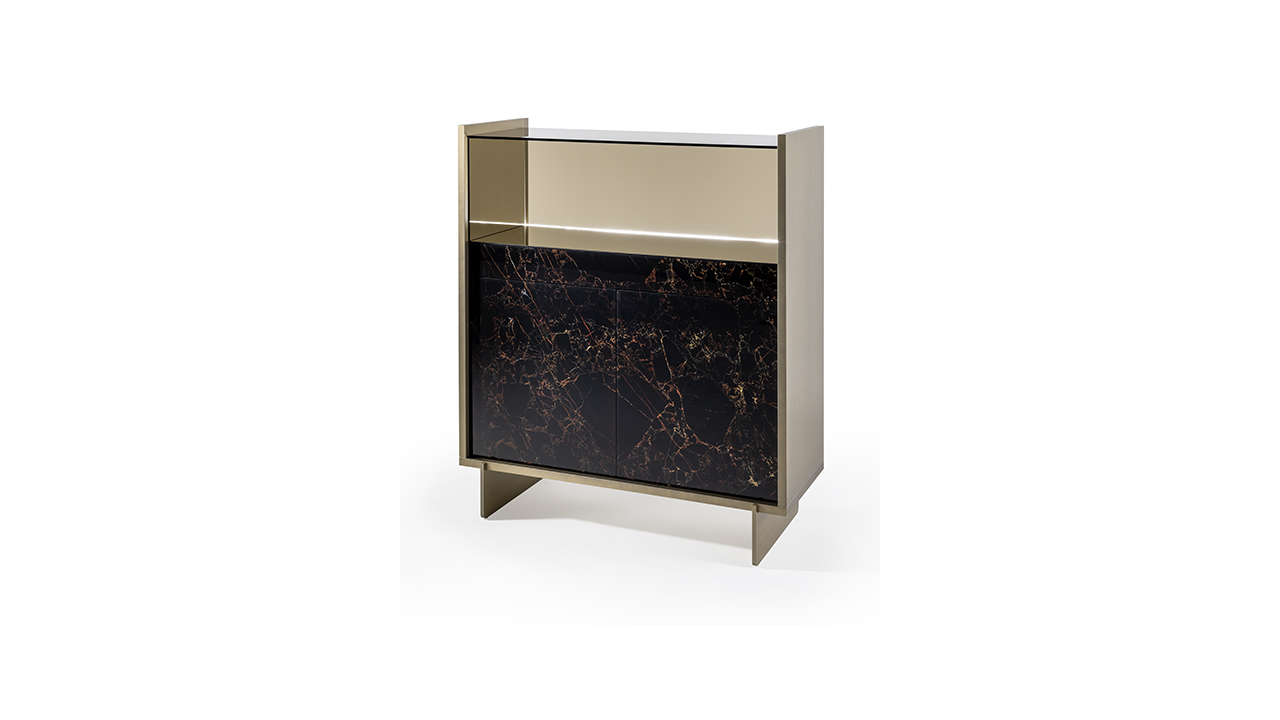 Madia con struttura in legno. Piedini in metallo finitura Bronze (100M). Ripiani interni in vetro extrachiaro.