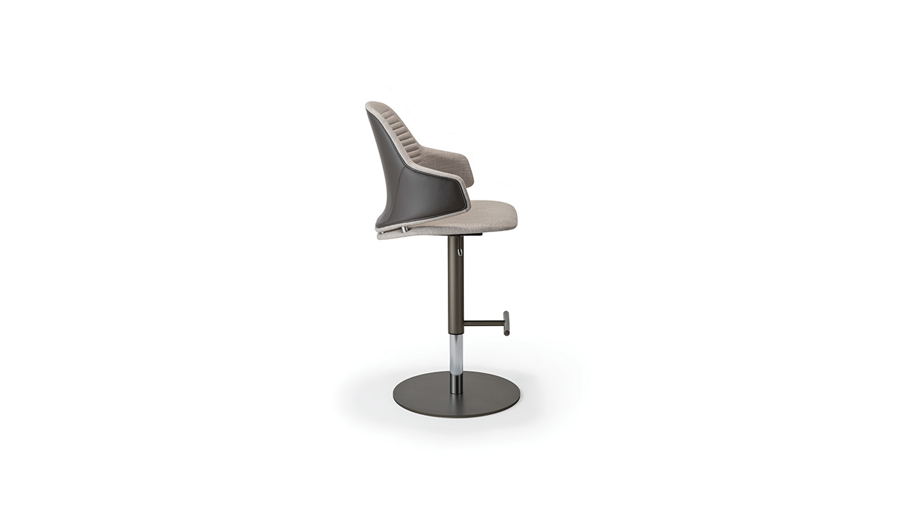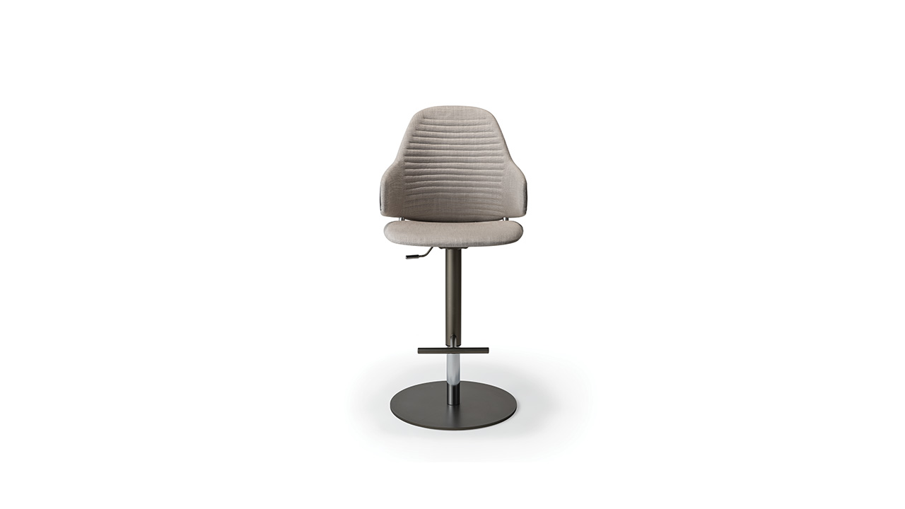 Sgabello con scocca in resina e legno, rivestito in pelle o tessuto. Schienale interno trapuntato. Base regolabile in altezza finitura Bronze (100M).