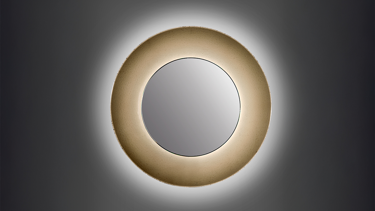 Specchio decorativo caratterizzato dall’abbinamento tra superficie riflettente extrachiara e cornice scultorea in vetro Acqua curvato. Un oggetto di forte presenza materica, pensato come elemento luminoso e decorativo a parete.