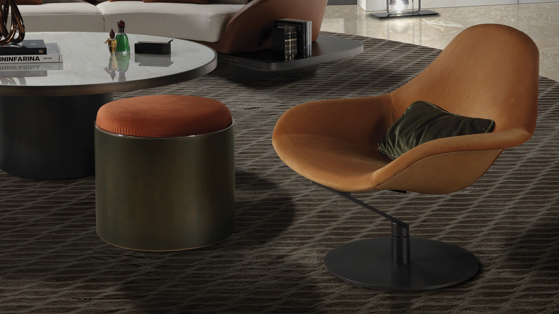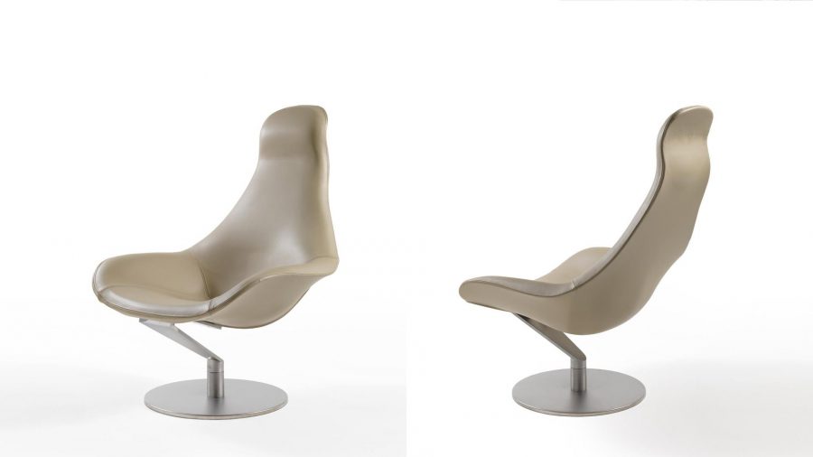 Poltrona con schienale alto. Rivestimento in tessuto o pelle. Basamento girevole in finitura satinata ottone, ottone dark, titanium, titanium dark.